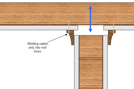 这个时候顶角线的固定方法就是一门学问了。一般来说施工人员为了便于施工,往往将顶脚线固定在内墙上,这样的话,顶角线就必然和上升的天花板形成空隙,也就是裂缝了。 正确的方法应该像下图那样,顶角线只固定在天花板上,不可用钉子固定在墙体上。顶角线与墙体的接缝处也不可打密封胶,这样的话,顶角线就可以自由的和天花板一起向上运动一定的距离,裂缝也自然不会出现了。